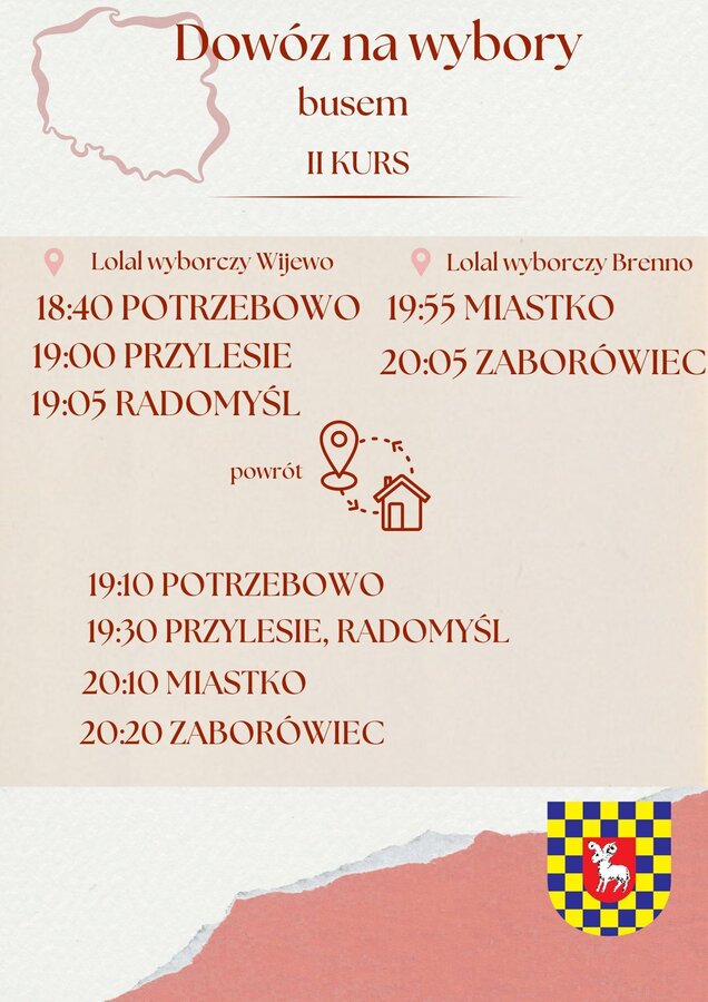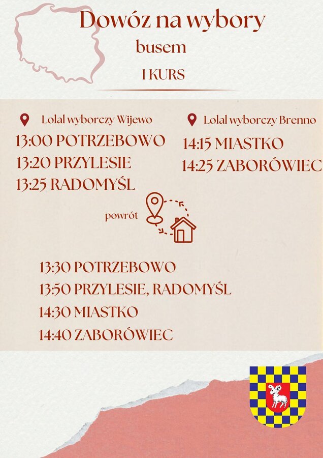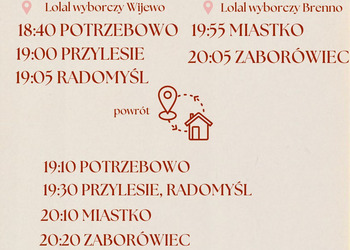 Zgodnie z art. 37f § 1 ustawy z 5.11.2011 r. - Kodeks wyborczy – dalej k.w., wójt gminy wiejskiej lub miejsko-wiejskiej w rozumieniu art. 21a ust. 1 pkt 2 ustawy z 13.11.2003 r. o dochodach jednostek samorządu terytorialnego - dalej u.d.j.s.t., w dniu wyborów organizuje bezpłatny gminny przewóz pasażerski dla wyborców ujętych w spisie wyborców w stałym obwodzie głosowania położonym na obszarze danej gminy, jeżeli w ramach tej gminy: nie funkcjonuje w dniu wyborów publiczny transport zbiorowy, o którym mowa w art. 4 ust. 1 pkt 14 ustawy z 16.12.2010 r. o publicznym transporcie zbiorowym - dalej u.p.t.z., albo najbliższy przystanek komunikacyjny, o którym mowa w art. 4 ust. 1 pkt 13 u.p.t.z., oddalony jest o ponad 1,5 km od lokalu wyborczego.