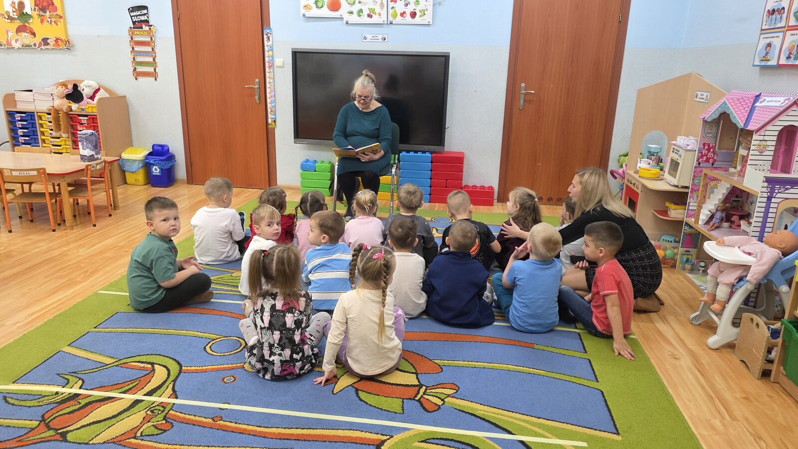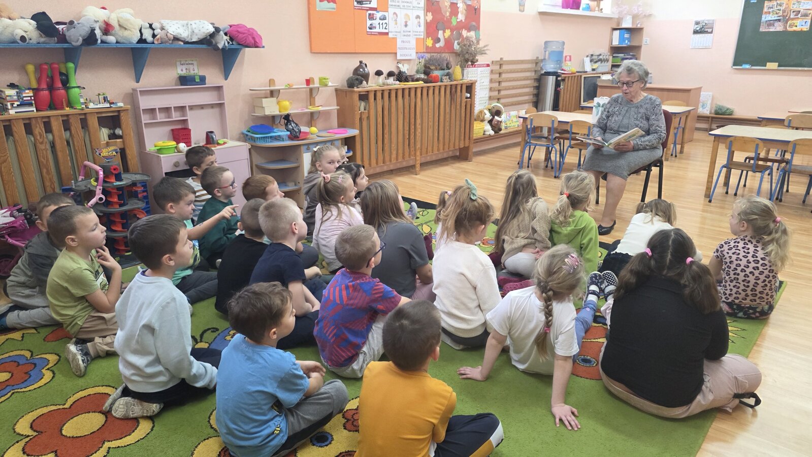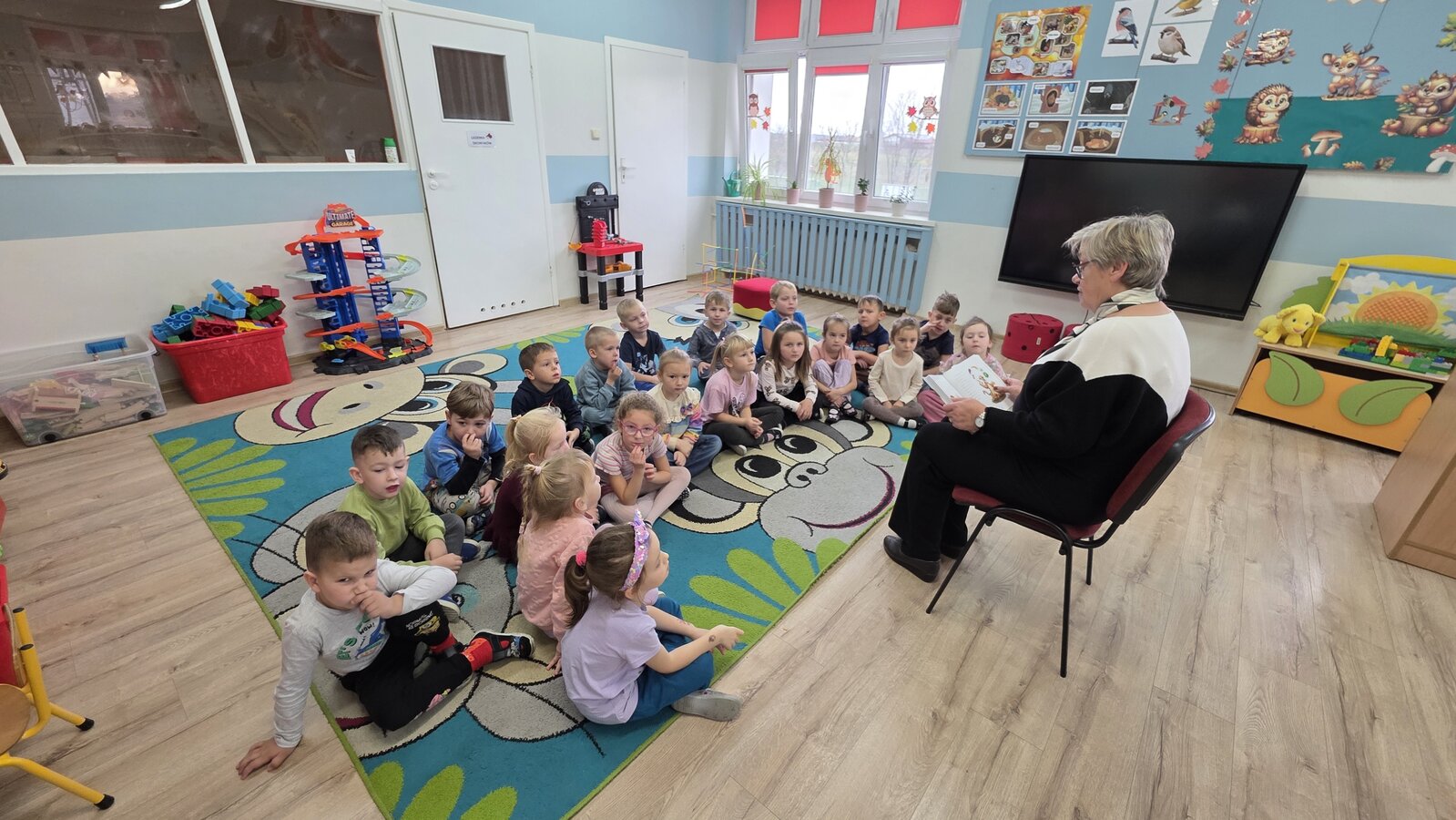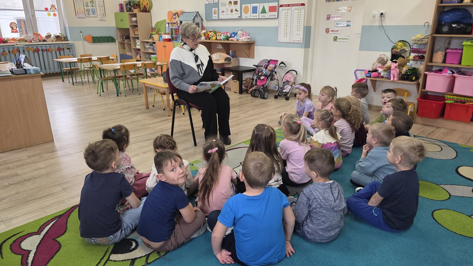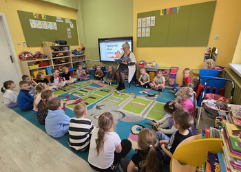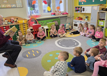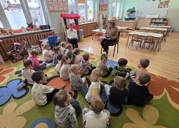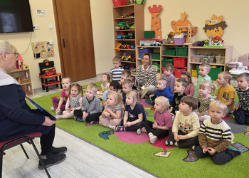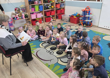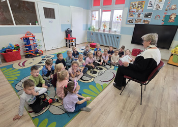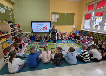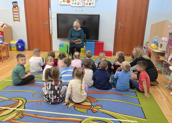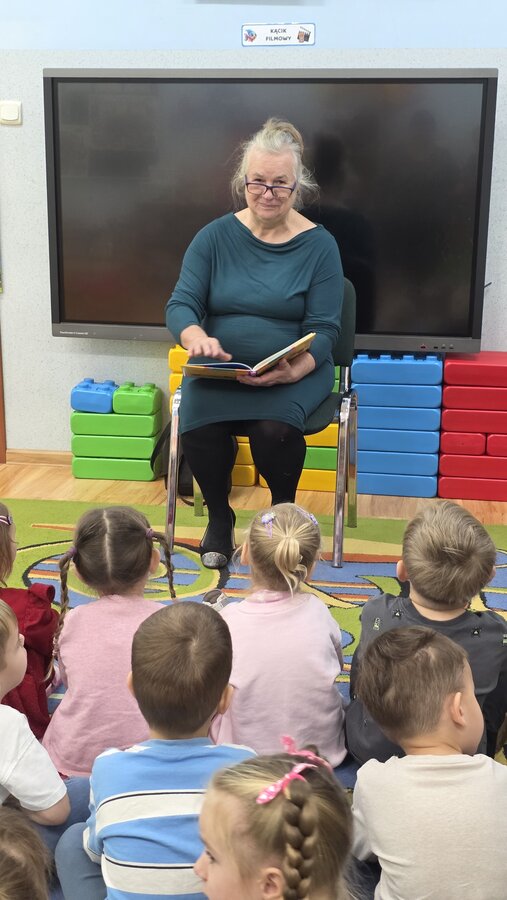 W salach panowała atmosfera zaciekawienia i radości. Dzieci siedziały zasłuchane, reagując śmiechem, zdziwieniem oraz pytaniami na kolejne fragmenty bajki.