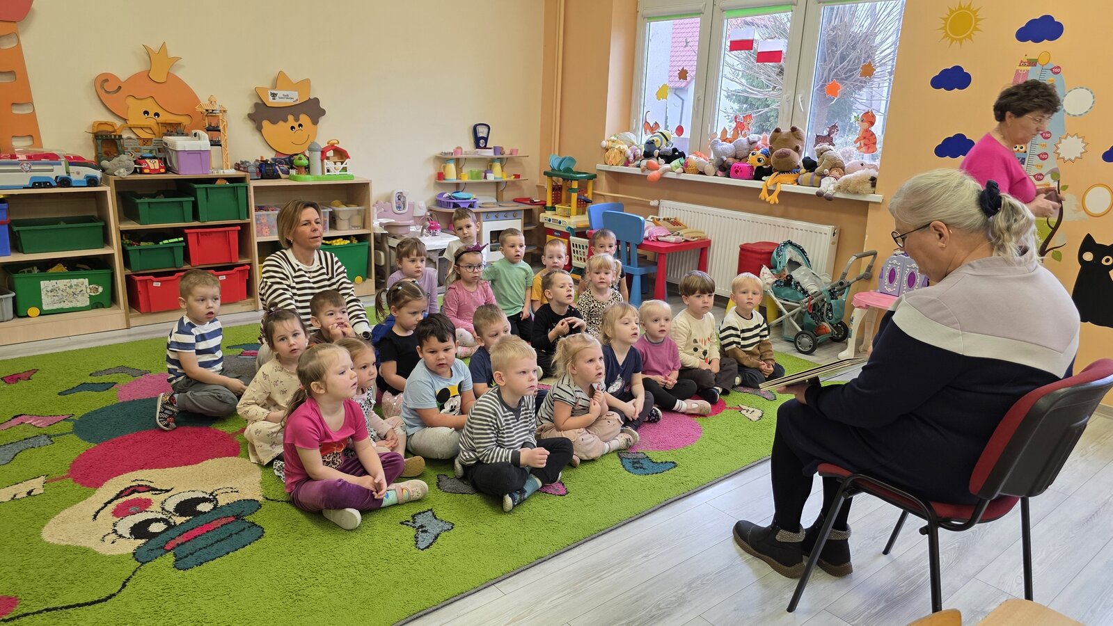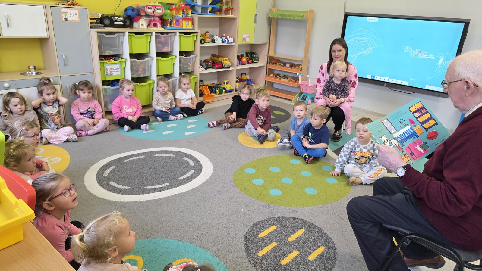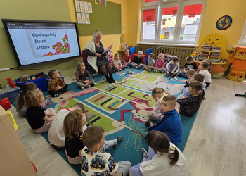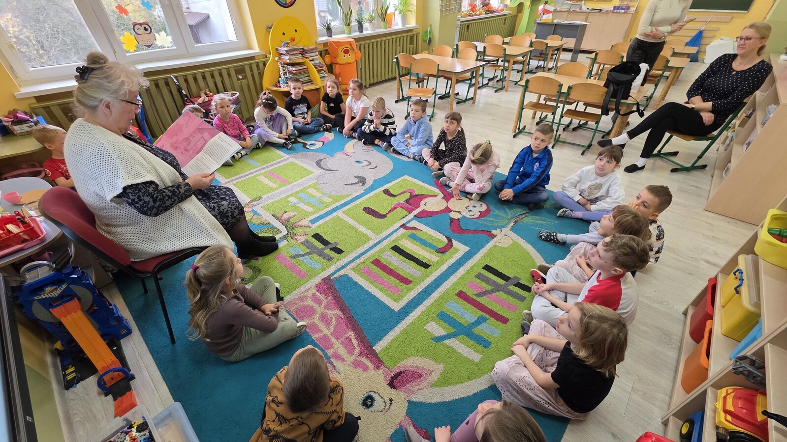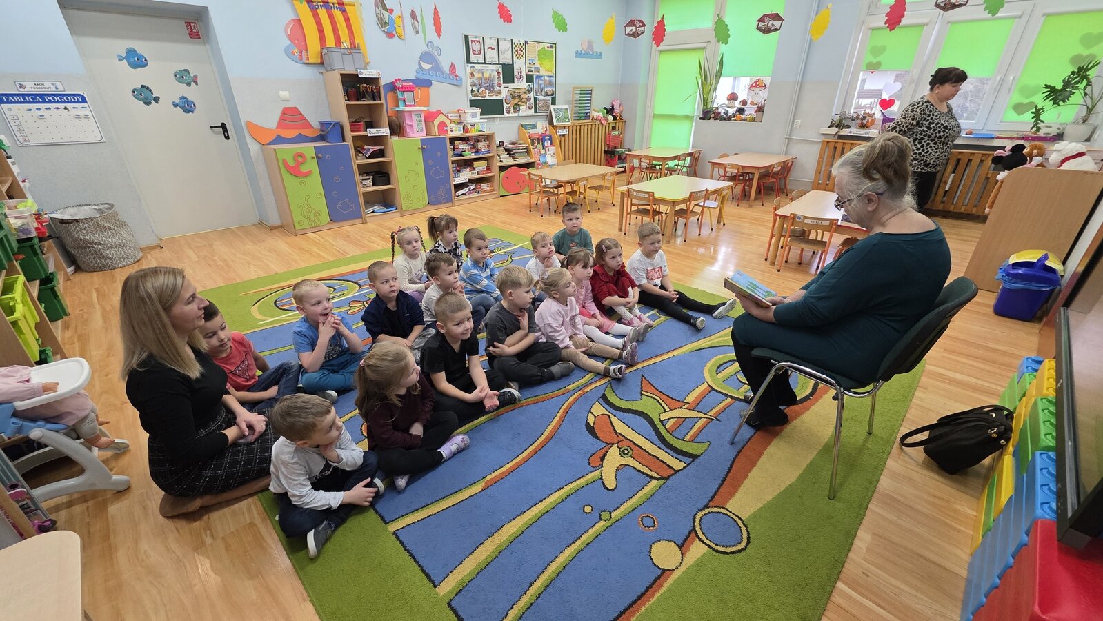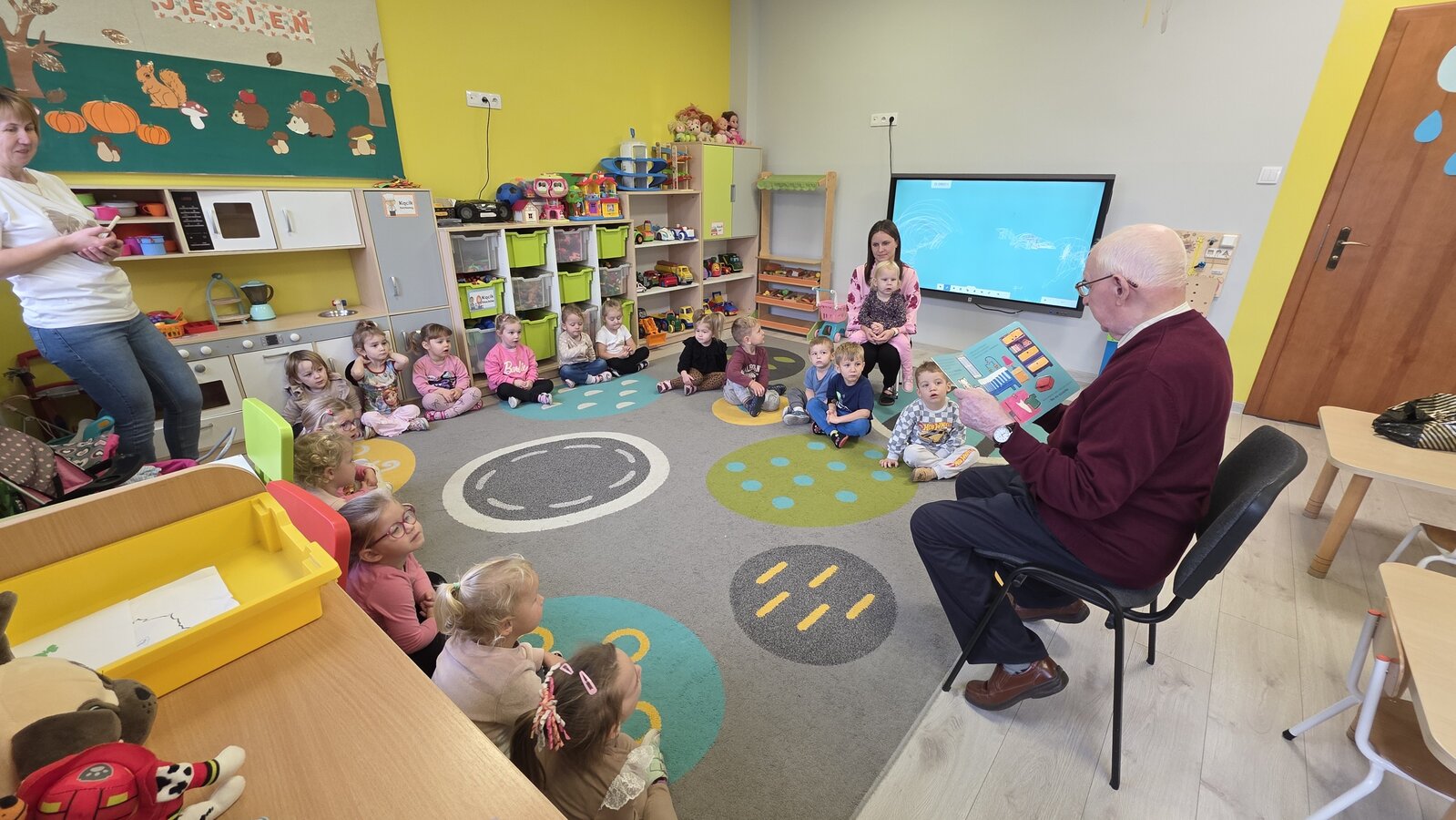 W salach panowała atmosfera zaciekawienia i radości. Dzieci siedziały zasłuchane, reagując śmiechem, zdziwieniem oraz pytaniami na kolejne fragmenty bajki.