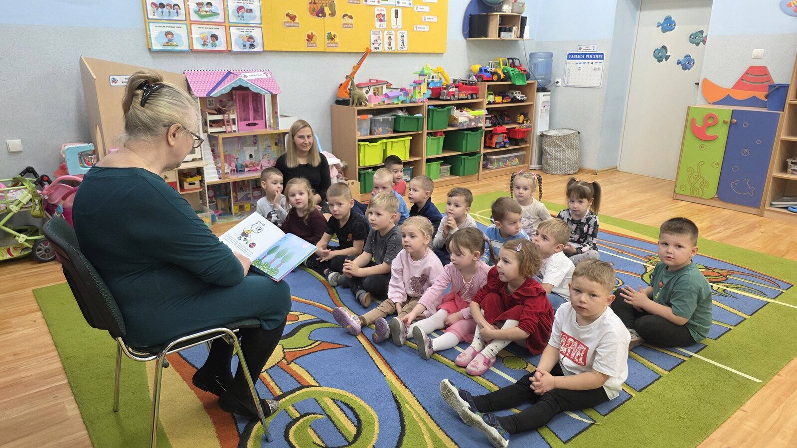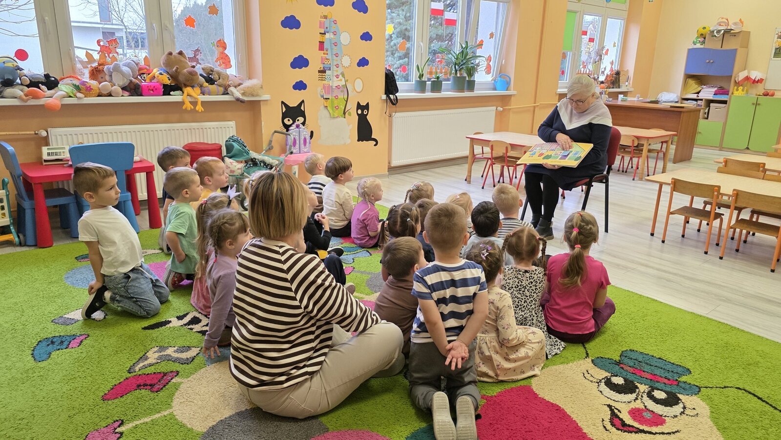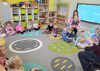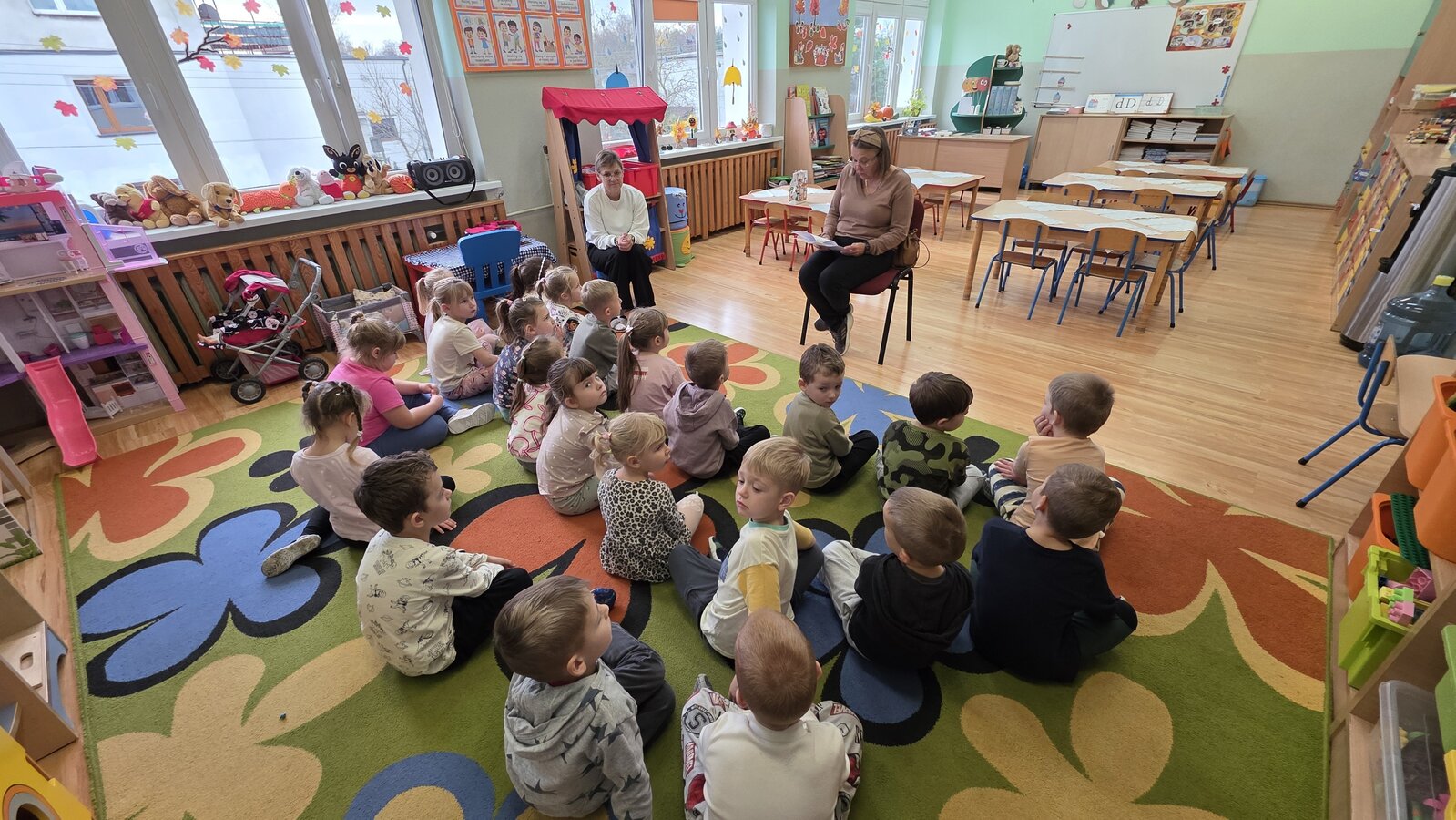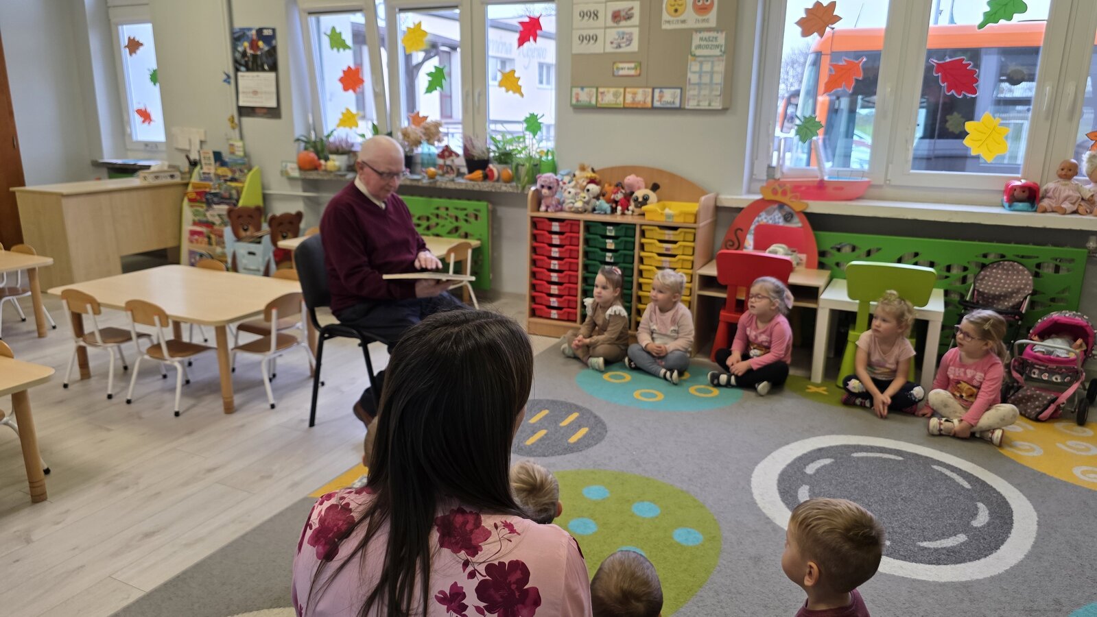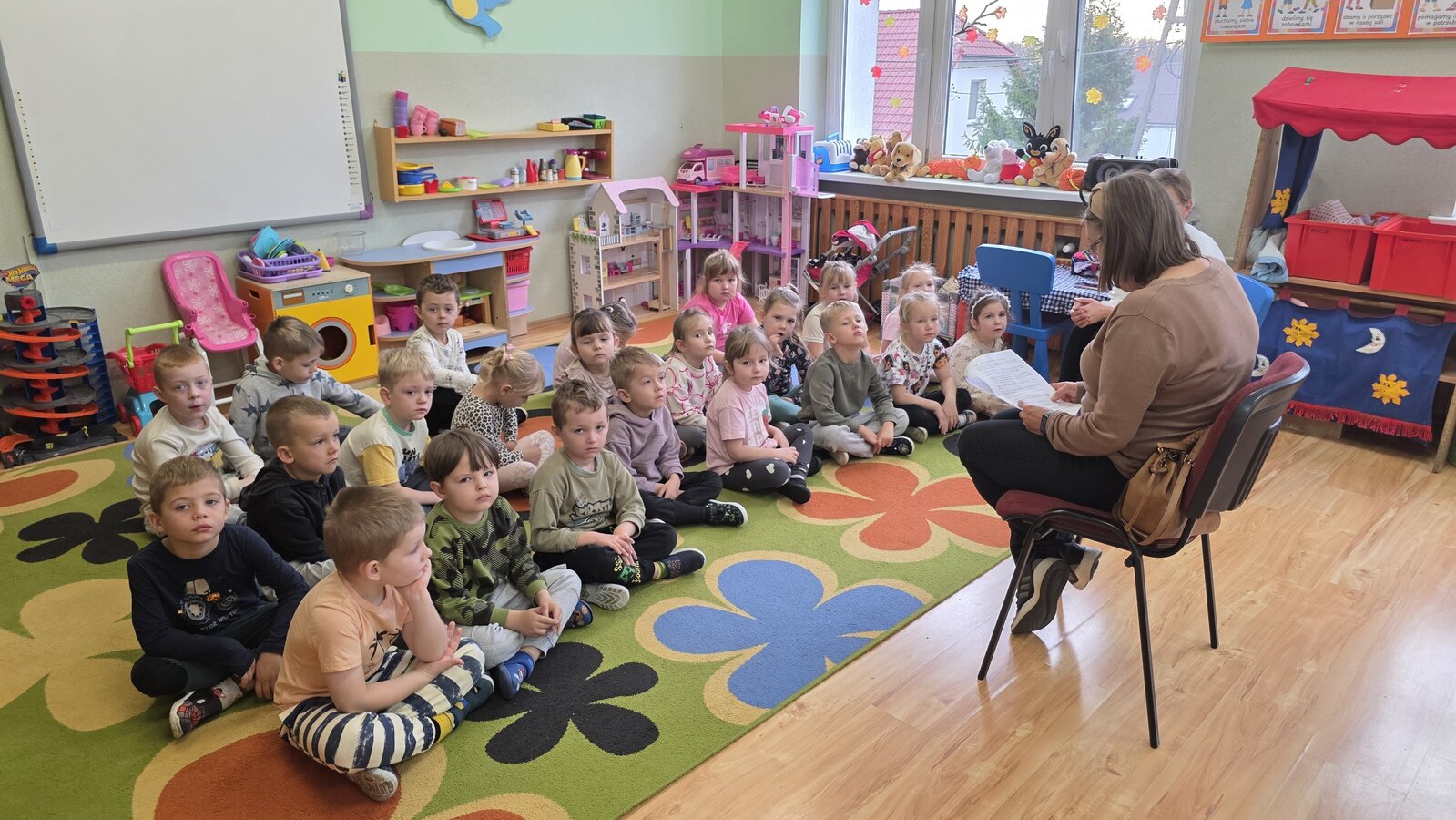 W salach panowała atmosfera zaciekawienia i radości. Dzieci siedziały zasłuchane, reagując śmiechem, zdziwieniem oraz pytaniami na kolejne fragmenty bajki.