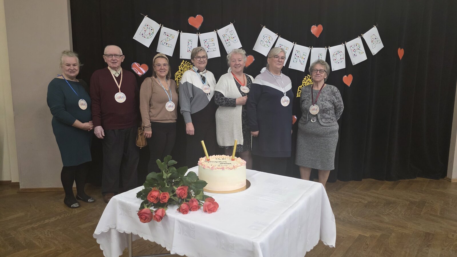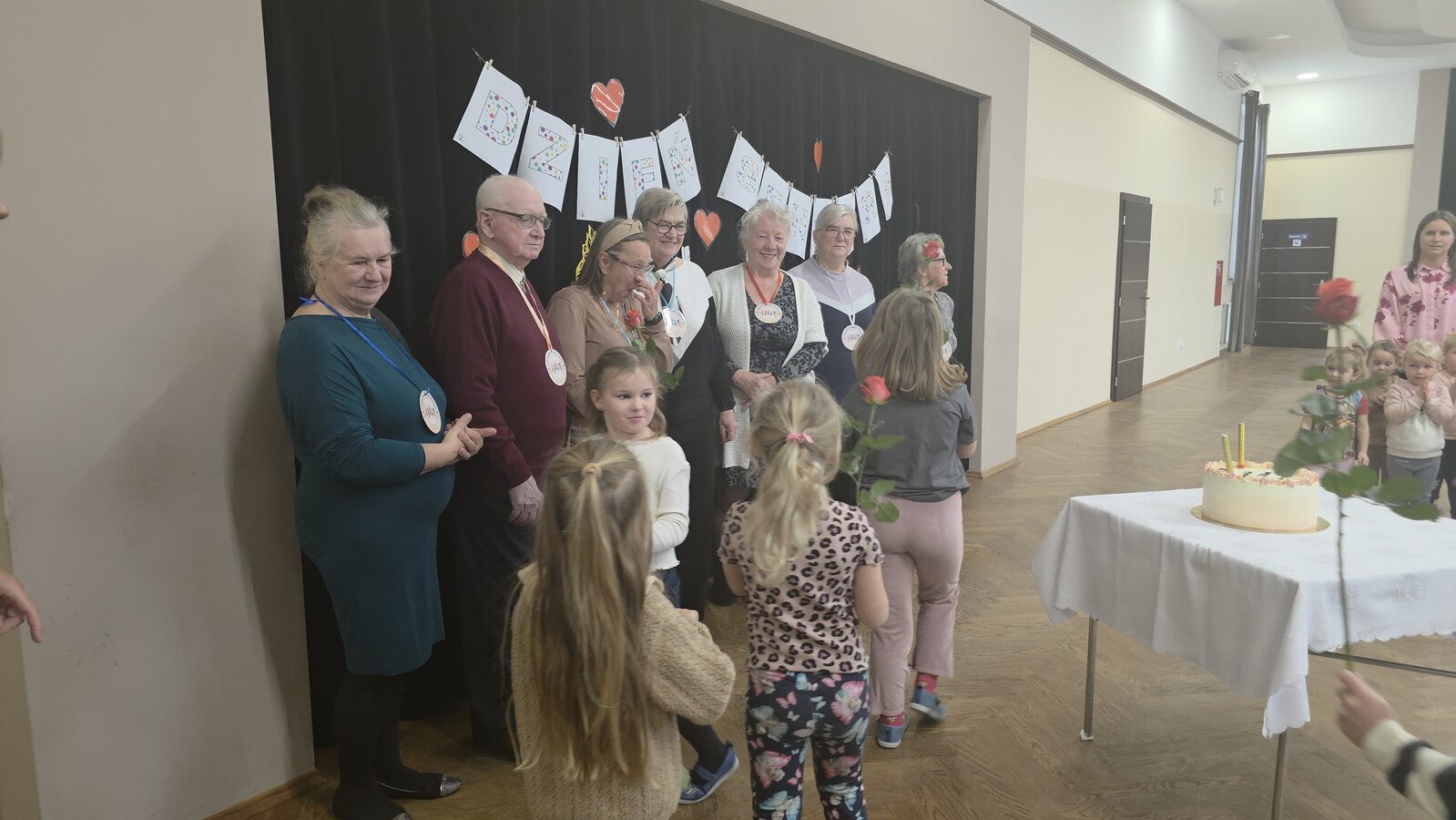 Pani dyrektor, Dorota Wolniczak złożyła Seniorom życzenia, a wszyscy odśpiewali gromkie „Sto lat”. Na twarzach Seniorów pojawiło się wzruszenie i ogromny uśmiech. Przedszkolaki wręczyły również gościom róże, a dla wszystkich Seniorów został przygotowany tort, ufundowany przez Radę Rodziców.