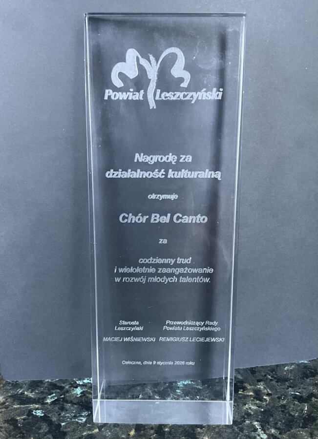 Z dumą informujemy, że Chór Bel Canto działający w Zespole Szkół im. Powstańców Wielkopolskich w Brennie oraz Szkole Podstawowej im. Króla Stanisława Leszczyńskiego w Wijewie został uhonorowany nagrodą Starosty Leszczyńskiego za wybitne osiągnięcia artystyczne oraz nieoceniony wkład w promocję kultury i edukacji muzycznej. Uroczystość odbyła się 9 stycznia podczas Koncertu Noworocznego w Centrum Kultury i Bibliotece w Osiecznej.