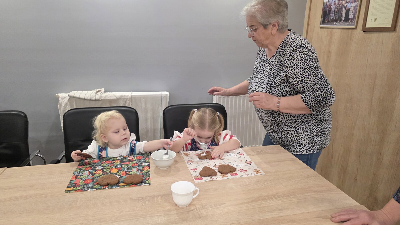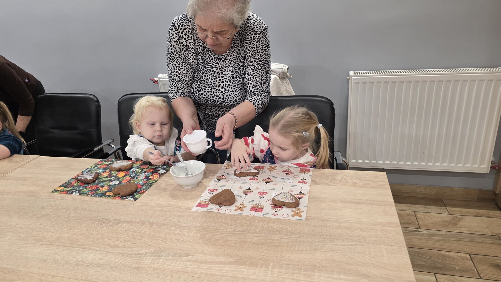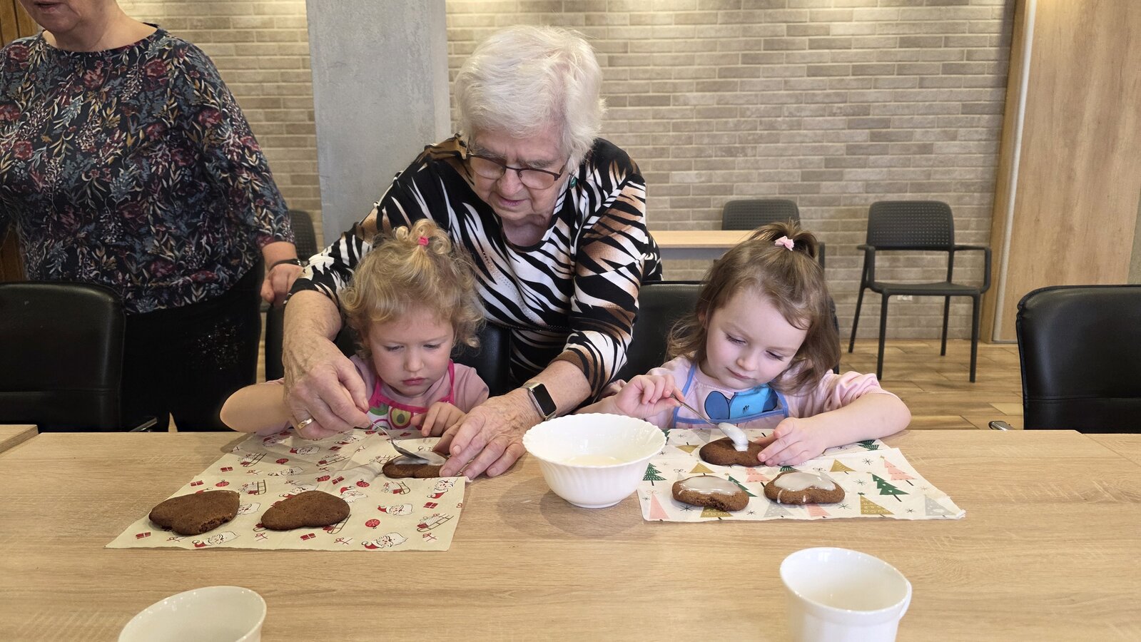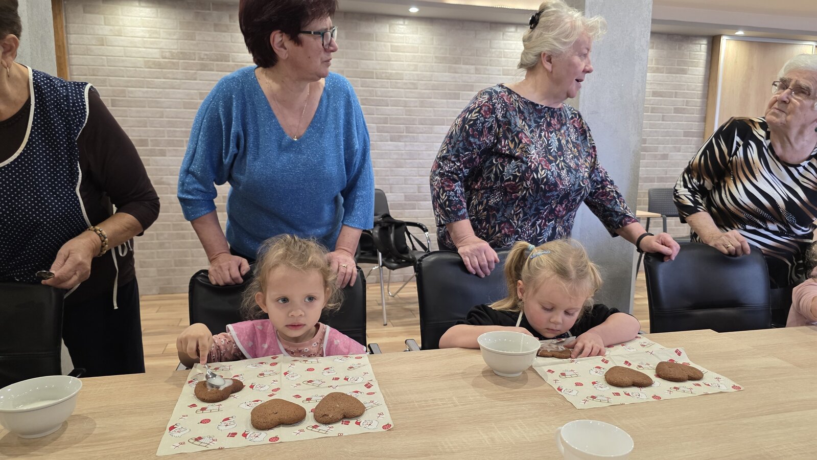 Na dzieciaczki czekały już gotowe stanowiska do dekorowania pierników – lukier oraz kolorowa posypka. Wszyscy po ubraniu fartuszków, zabrali się z entuzjazmem do pracy! Nasi Seniorzy starali się jak mogli, żeby pomóc maluchom w pracy. Efekt był świetny! Wszyscy przygotowali po trzy serduszka, które zabrali ze sobą do domów.