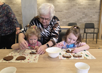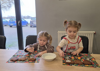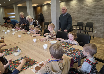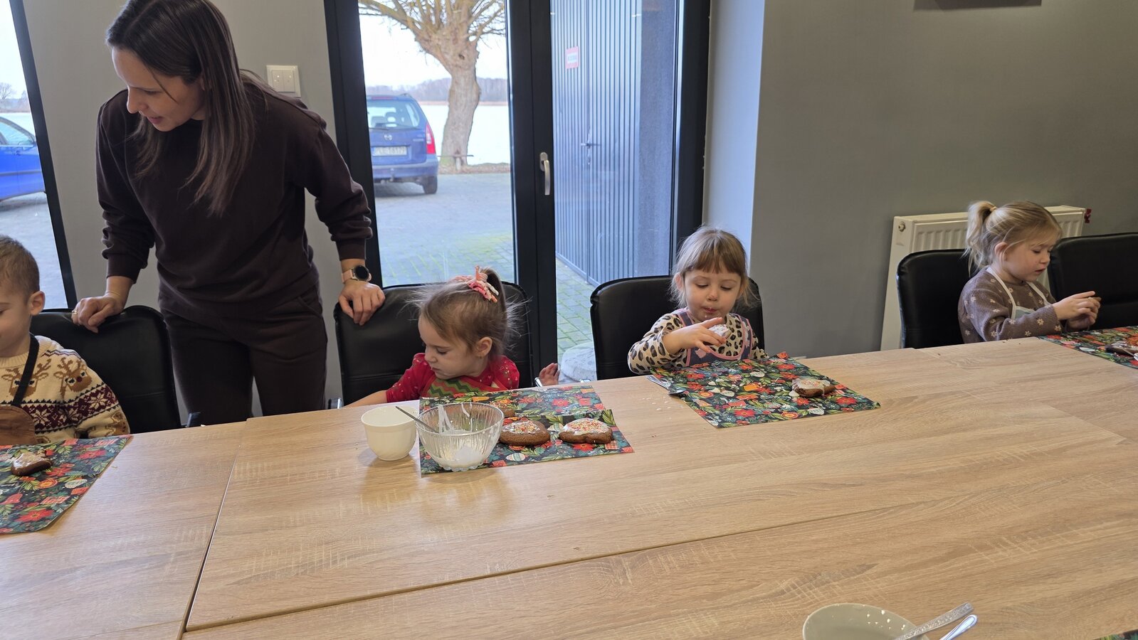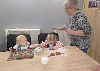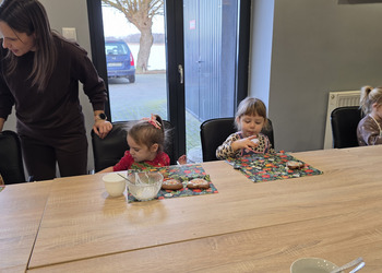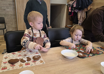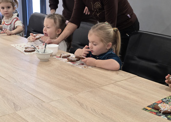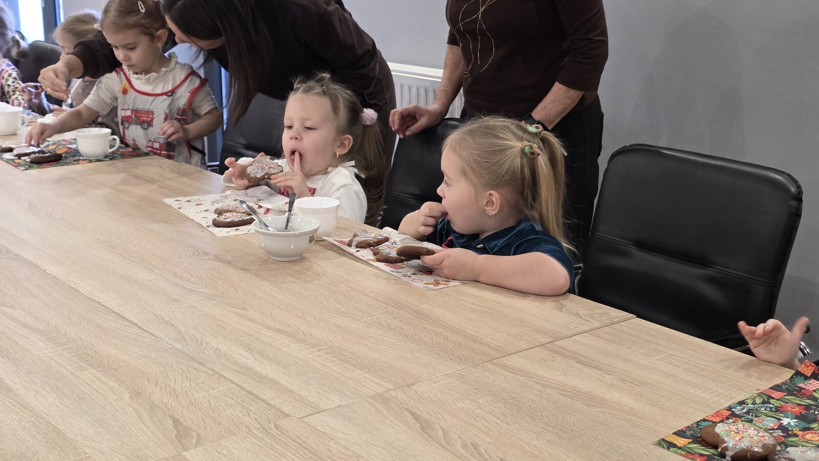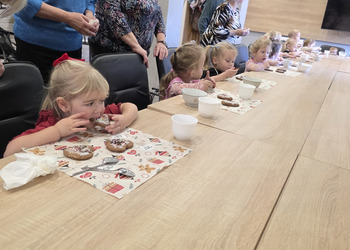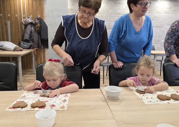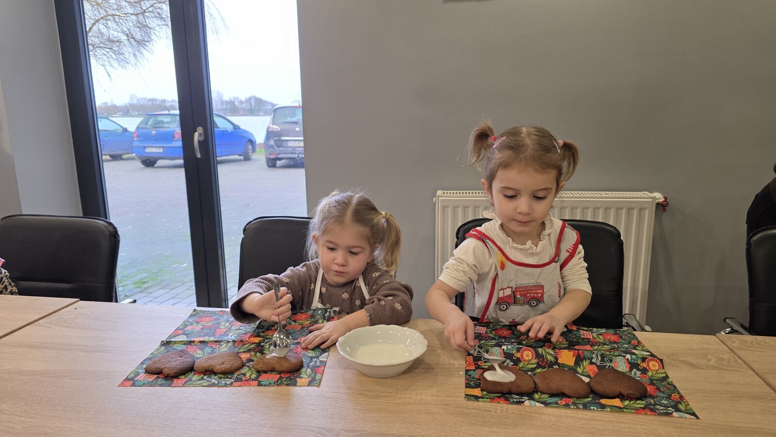 Na dzieciaczki czekały już gotowe stanowiska do dekorowania pierników – lukier oraz kolorowa posypka. Wszyscy po ubraniu fartuszków, zabrali się z entuzjazmem do pracy! Nasi Seniorzy starali się jak mogli, żeby pomóc maluchom w pracy. Efekt był świetny! Wszyscy przygotowali po trzy serduszka, które zabrali ze sobą do domów.