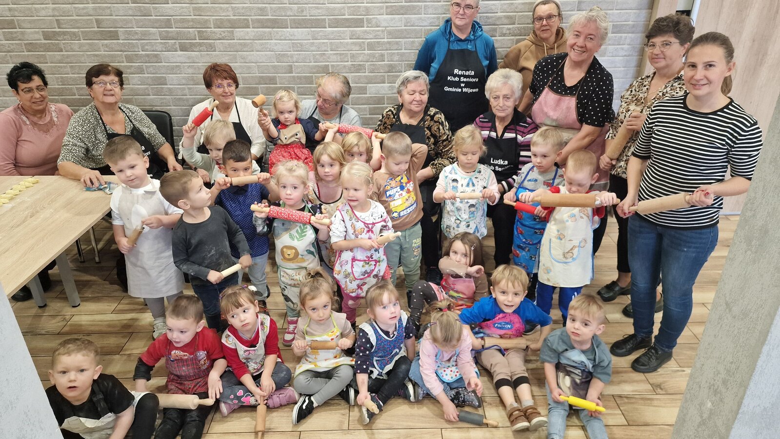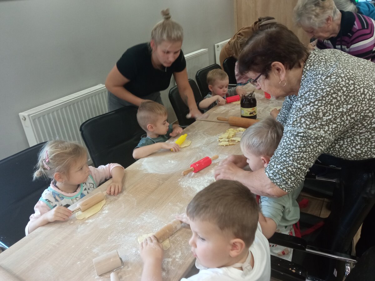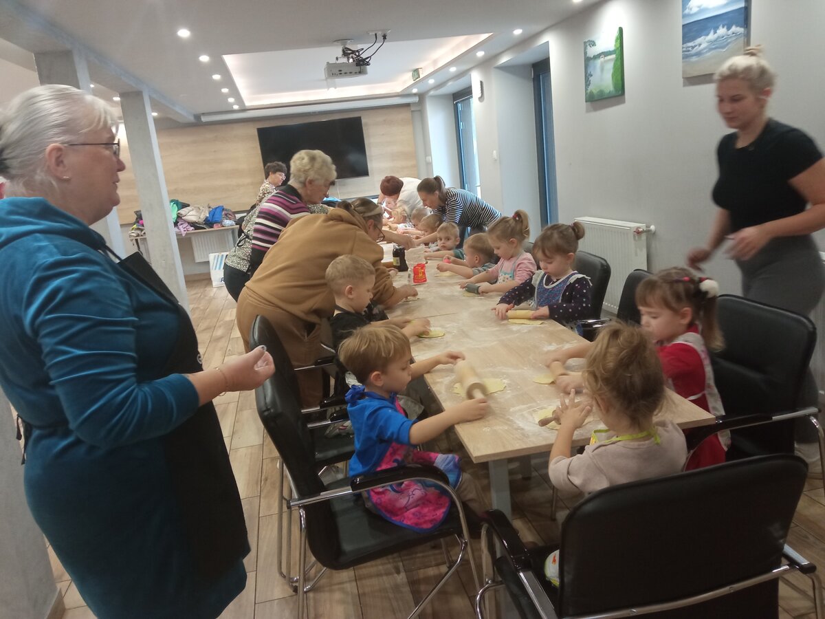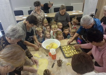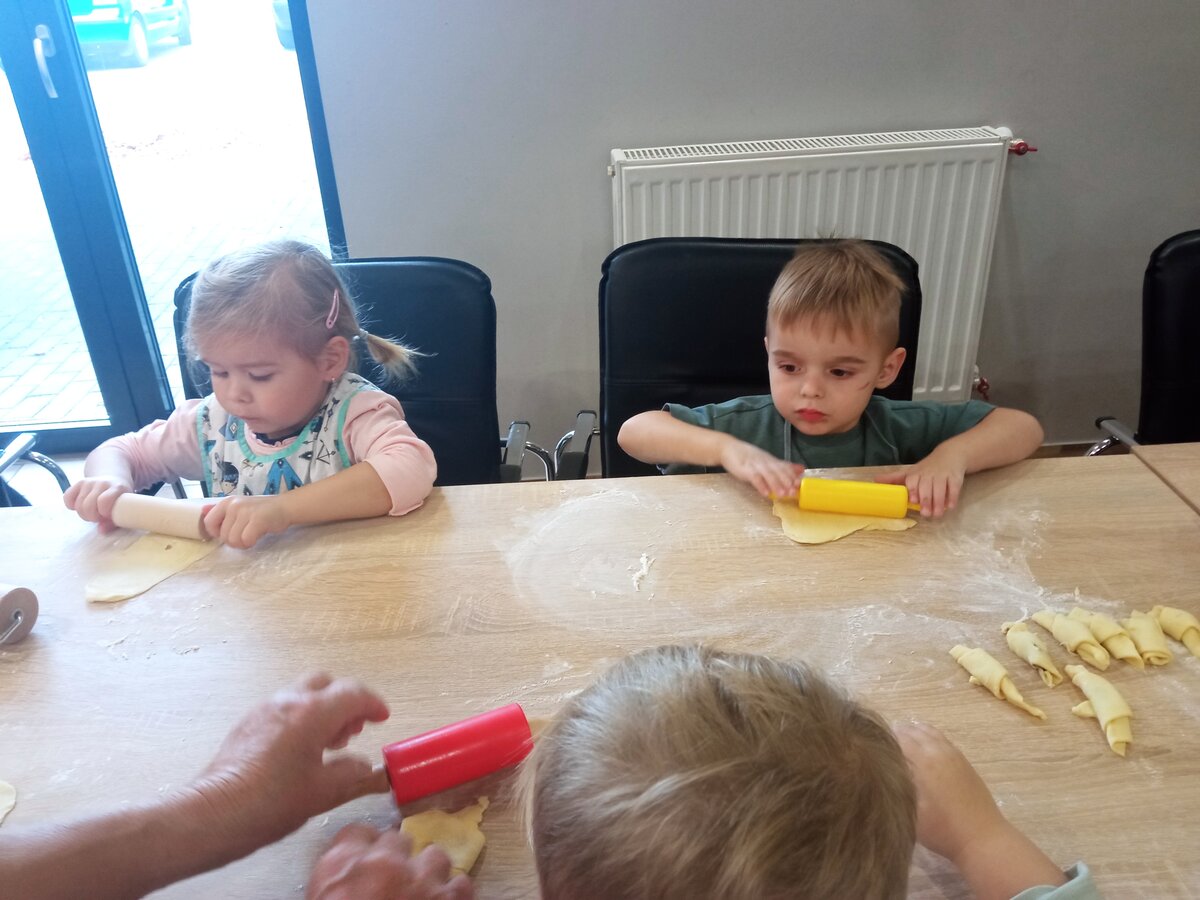 Głośno i wesoło zrobiło się w naszym Klubie w środę 6 listopada, a to za sprawą przedszkolaków z grupy „Pszczółki” z Samorządowego Przedszkola w Wijewie. Dzieciaczki przyjechały do nas piec rogaliki. Każdy przedszkolak miał swój fartuszek oraz wałek. Nasze Seniorki zrobiły wcześniej ciasto, które po wyrośnięciu dzieci wałkowały i nadziewały powidłami. Zabawa była wspaniała! Dzieci świetnie sobie radziły i spod wszystkich pracowitych rączek wyszły pyszne rogaliki, które później wszyscy zjedli. A że ciasta było dużo, nasze Seniorki zrobiły większą ilość, którą dzieci zabrały ze sobą do domów.