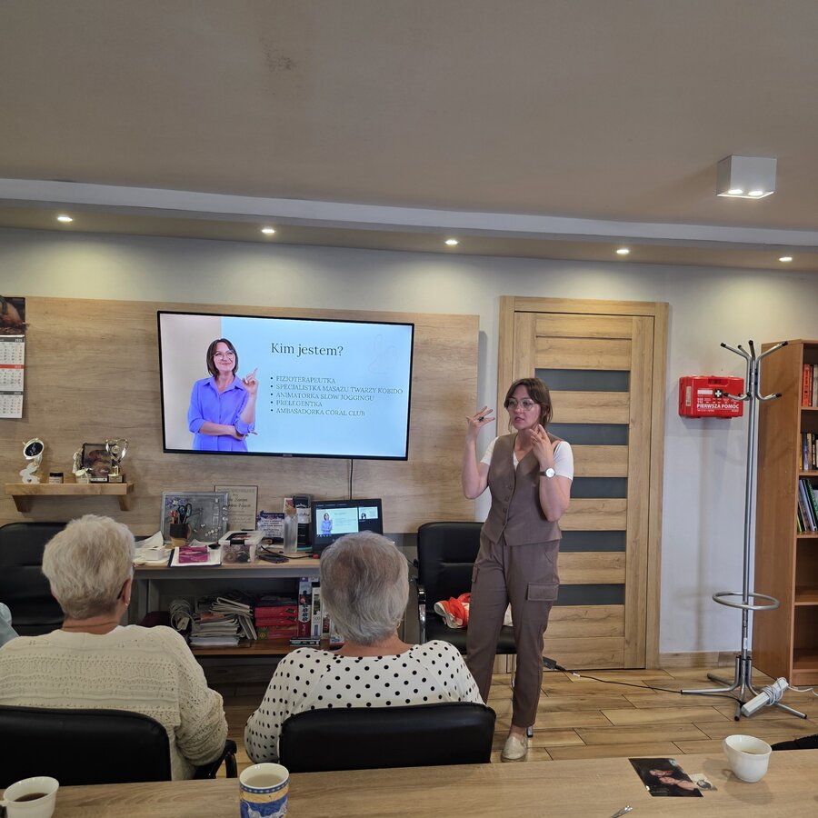 Temat wykładu przyciągnął bardzo dużą liczbę Seniorek, co nas bardzo cieszy. Na początku spotkania pani Ewa opowiedziała o starzeniu się skóry, jak wygląda to zjawisko i jakie są jego główne objawy (zmarszczki, przebarwienia czy też wysuszenie skóry) oraz co robić żeby opóźnić ten proces, czyli masaże za pomocą różnych technik i różnych narzędzi. Panie dowiedziały się też jakie dodatkowe czynniki wpływają na zmianę w wyglądzie: bruksizm, stres, zła pozycja kręgosłupa, wady zgryzu czy też nieleczenie lub utrata zębów.